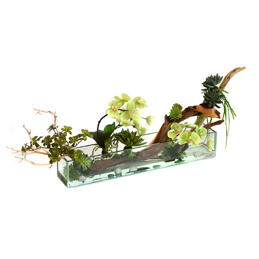 Green Phalaenopsis Orchid, Wood & Succulent Arrangement in 24" Plate Glass Planter